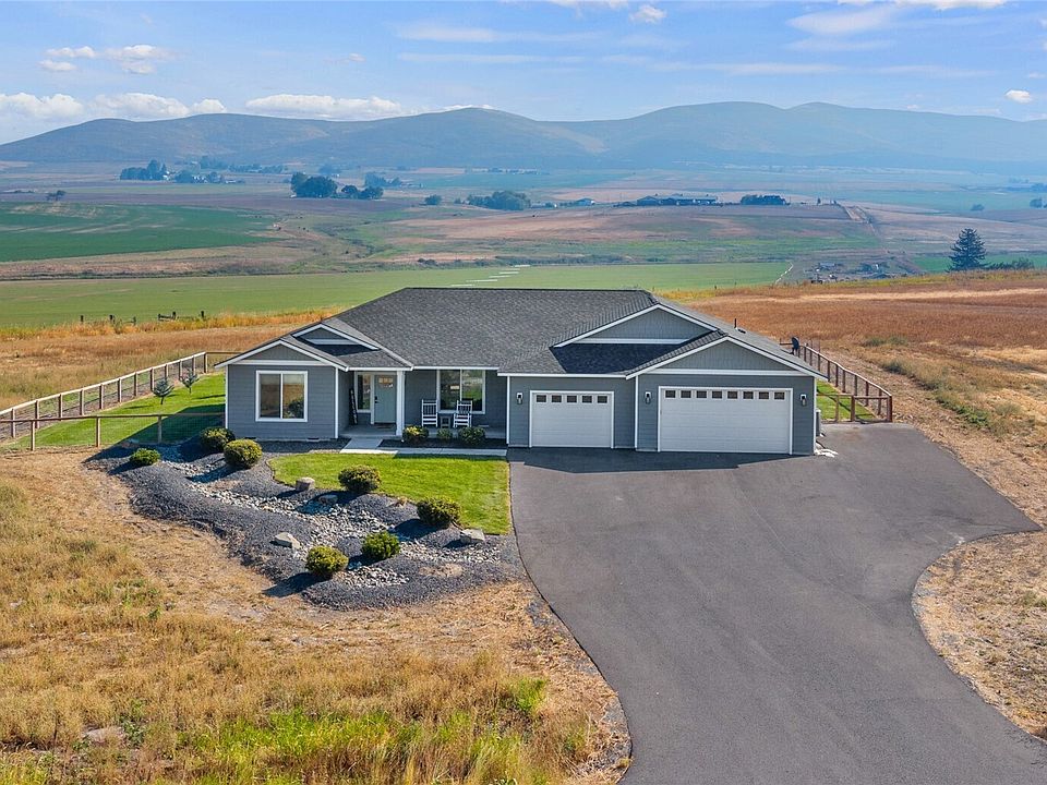Built in 2021 & perched on 4.78 irrigated acres, this spacious custom home features luxe upgrades including an airy kitchen with quartz countertops, a butler’s pantry with built-in Monogram refrigerator, a touch faucet, under cabinet lighting, large island, 3 car attached garage, and more. Taking up 2,242 sqft of living space are 4 bedrooms, 1.75 bathrooms, an open concept kitchen with dining area that flows into the great room, and a utility room with a built-in dog wash. Through the sliding glass doors, you’ll discover the covered back patio looking over the fully fenced backyard with built in sprinklers and beautiful Badger Pocket views. Experience expansive country living without sacrificing modern comforts, schedule your tour today!