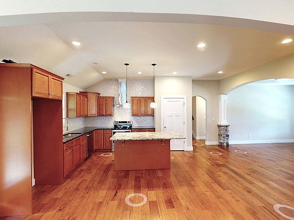 Upon arrival, you'll be greeted by a lovely front porch, and a garage with stone accents. Inside, the open floor plan includes a bright and spacious, a formal dining room, and a comfortable living room. The kitchen features custom 48-inch cabinets, crown molding, upgraded appliances, and granite countertops. The dining area ceilings feature coffered accent, while the living room boasts vaulted ceilings and a rock fireplace extending to the ceiling. This home offers 9-foot ceilings throughout, with hardwood flooring in the living areas and carpet in the bedrooms. The split-bedroom layout places the master bedroom on one side, with two additional bedrooms on the other. The master bedroom includes a coffered ceiling, a large walk-in closet, and a luxurious bathroom with , a large custom shower and double vanity. The other two bedrooms are generously sized. Above the garage is a large room features great space and a closet....4th bedroom or whatever your living needs may be. The backyard offers a covered porch with ample space and a 10ft tall crawl space is a great place for storage!