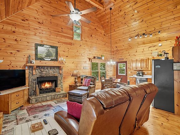 Welcome to the North Georgia Mountains! Tucked away in the woods of Walnut Mountain, a true mountain community, this fully furnished turn-key vacation rental is ready for you or your guests to enjoy. Step inside to find a picture-perfect great room with a stone fireplace, flanked by windows that bring the outdoors in. The main level features 2 cozy bedrooms and a full bath, while the upper level offers a spacious master suite complete with a full bath, large owner's closet, a secondary closet, and a private screened porch—the ideal spot for morning coffee or evening sunsets. The terrace level is designed for fun and relaxation with a den and game room, plus a large storage room perfect for keeping rental supplies organized. Outside, guests will love the private hot tub and fire pit area, the perfect place to unwind under the stars. Located within the gated Walnut Mountain community, this cabin includes access to paved roads, high-speed internet, a swimming pool, hiking trails, peaceful lakes, and even a campground. Just minutes from Historic Downtown Ellijay, apple orchards, mountain biking trails, and award-winning wineries—this property checks all the boxes for the ideal mountain getaway or investment.