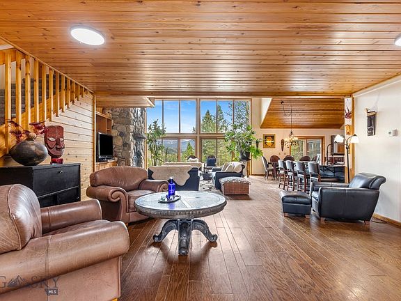 The private 20-acre getaway in Riverview Ranch offers serenity, seclusion, and breathtaking views. A full-length covered porch spans the front of the home, offering sweeping views of the south entrance to Big Sky. Step inside to a warm and inviting open-concept design, featuring expansive windows that allow natural light and breathtaking views of the Gallatin River and the Gallatin Mountain Range. The expansive deck, fenced yard, and a water feature create an idyllic setting for entertaining guests or enjoying quiet, peaceful moments. At the heart of the home, the great room features a floor-to-ceiling river rock wood-burning fireplace, along with vaulted wood ceilings. The functional kitchen is equipped with a gas Viking cooktop, double ovens, and ample dining space. Perfect for hosting dinner parties or casual get-togethers. Accommodations on the main floor, include a primary bedroom with an en-suite bath and walk-in closet, two additional bedrooms, a full bath and an office. A plus for hosting family and friends is the Bonus room with a private bath. Overlooking the Great Room, the spacious loft offers versatile space, currently used as sleeping quarters, an exercise area, and a game room. An attached two-car garage leads seamlessly into the mud/laundry room, providing a practical, functional transition from outdoor adventures to indoor living. Blending Montana Mountain living with modern comfort, this property delivers all, including elk, deer, birds, and other visible seasonal wildlife.
