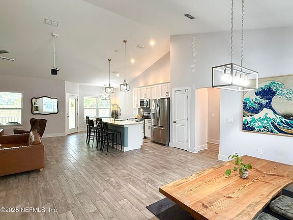 NO HOA! WALK TO BEACH! HIGH AND DRY! Built in 2021, this beautifully maintained 3 bedroom 2 bathroom island cottage offers an open floor plan with vaulted ceilings, a spacious 2-car garage, and a split bedroom layout. Enjoy peaceful mornings on the covered back porch or imagine your future pool (renderings on file and estimate available upon request)! This home is nestled high and dry in a NO HOA neighborhood right between the intracoastal and the beach on a dead-end street. Walk or bike to the beach, coffee shops, restaurants and more! Multiple beach accesses (vehicle access and walkovers) to choose from nearby and boat launch to intracoastal waterway just 2 miles south! Equipped with outdoor shower, fruit trees and tropical plants. Modern living, coastal convenience and room to grow! **Transferrable 10-year Home Buyers Structural Warranty coverage in place (Warranty Effective Date 01/25/2022).**