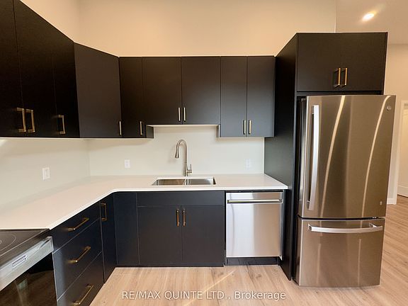 Be the first to live in this newly built one-bedroom, one-bathroom apartment inside a fully restored 1846 heritage building in the heart of Tweed. This 500 sq ft main floor unit is part of a complete transformation taken back to bare bones and newly constructed from the inside out, combining timeless character with high-end modern finishes.The kitchen features custom black slab cabinetry with solid wood interiors, white quartz countertops, and brand new stainless steel appliances. The same quartz continues into the bathroom, which includes a tiled shower and tiled floors. The unit is finished with luxury vinyl plank flooring throughout, beautiful designer light fixtures, and ample pot lighting for bright, modern living. Enjoy the convenience of an in-suite all-in-one washer and dryer, a high-efficiency heat pump for heating and cooling, a dedicated hot water tank, and a private mechanical/storage room. One outdoor parking space is included. The building has all new hydro and water services, with separate meters for each unit. Tenant is responsible for all utilities (hydro, heat, and water). No pets and no smoking permitted. First and last months rent required. Located just steps from shops, cafes, parks, and the shores of Stoco Lake, this beautifully restored landmark offers small-town living with everyday convenience. Tweed is a vibrant, welcoming community with scenic trails and year-round recreation all just 30 minutes from Belleville. Available immediately.