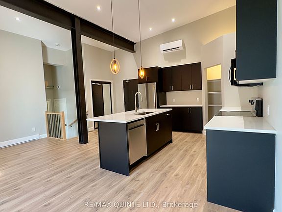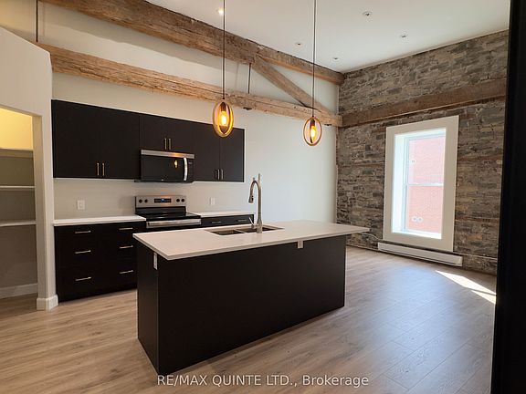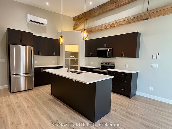 This architecturally distinct 1-bedroom, 1-bathroom apartment is a standout within a fully restored 1846 heritage building in the heart of Tweed. Custom-built interior within a historic stone structure, this unit offers soaring ceilings (approx. 15) and stunning heritage details, including exposed limestone walls, original wood beams, and exposed structural steel, delivering a truly one-of-a-kind living space. The bright, open-concept kitchen features a large island, white quartz countertops, custom black slab cabinetry with solid wood interiors, a corner walk-in pantry, and brand new stainless steel appliances. The main living area is finished with luxury vinyl plank flooring, stylish light fixtures, and ample pot lighting for a warm, modern atmosphere. A half set of stairs leads down to the cozy, carpeted bedroom, offering a touch of separation and privacy. The bedroom features high ceilings, a large closet and an additional storage area. The bathroom includes a tiled shower, quartz vanity, tiled floors, and generous built-in storage. Additional features include an in-suite all-in-one washer and dryer, private hot water tank, mechanical/storage room, and energy-efficient heat pump for heating and cooling. One outdoor parking space is included. The building is fully updated with all new hydro and water services, and each unit is separately metered. Tenant pays hydro, heat, and water. No pets and no smoking permitted. First and last months rent required. Enjoy life in the charming village of Tweed, just steps from local shops, parks, and the shores of Stoco Lake. This architecturally unique unit offers character, comfort, and convenience in a vibrant small-town setting. Available immediately.