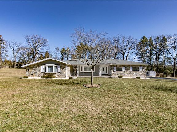 Offers due 3/19 @5pm. This spectacular stone & brick Ranch is peacefully nestled on an expansive 1.2 acre flat, private lot in much admired Macada Farms. The impeccable curb appeal & welcoming covered patio make a fantastic first impression! Once inside, gleaming hardwoods, spacious room dimensions & plentiful windows enhance this home's meticulous interior. The open floor plan & easy flow create a myriad of relaxing & inviting spaces to enjoy family & friends! A stone fireplace, built-in bookcases & light filled bay window accentuate the magnificent LR. The Eat-in Kitchen boasts rich oak cabinetry & SS appliances, a formal DR adjoins & seamlessly makes way to the alluring Sun Room ~ offering picturesque views of the outdoors. The cozy FR creates a restful space to unwind after a long day. Three generously proportioned Bdrms, including a lovely Primary Suite & 2 full Baths complete the 1st fl. The partially finished LL, Over-sized 2 Car Garage, Shed & full Attic will surely impress!