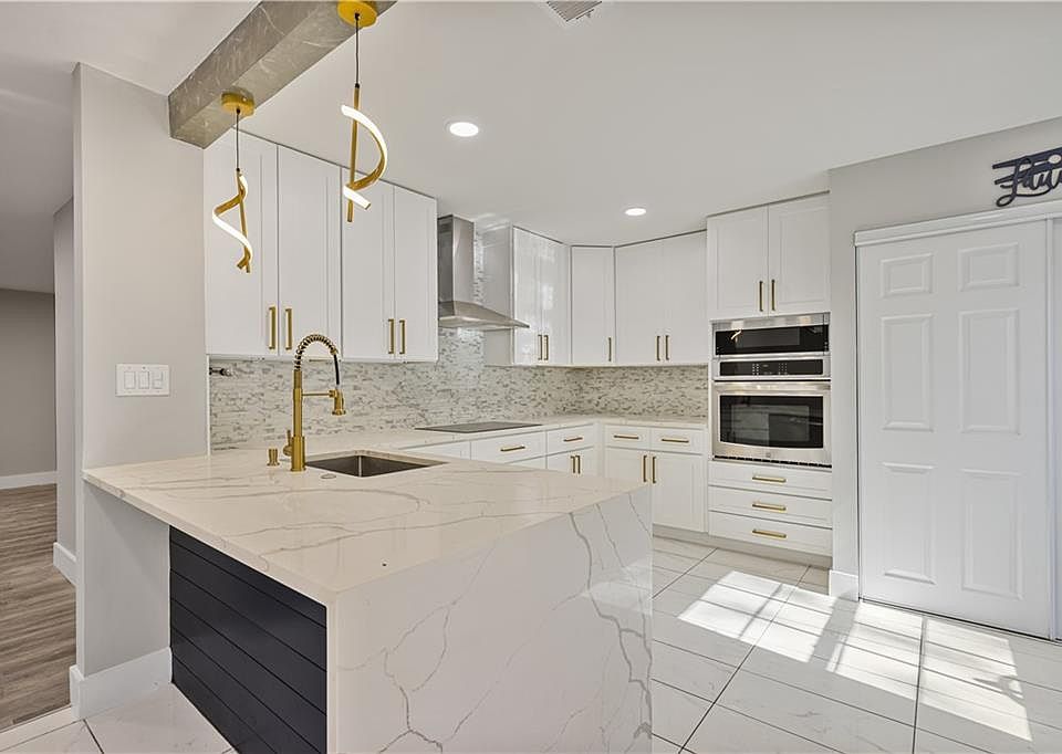 Sparkling poolModern hardwareElectric fireplaceFilled with natural lightSleek waterfall islandQuartz countertopsWhite cabinetry