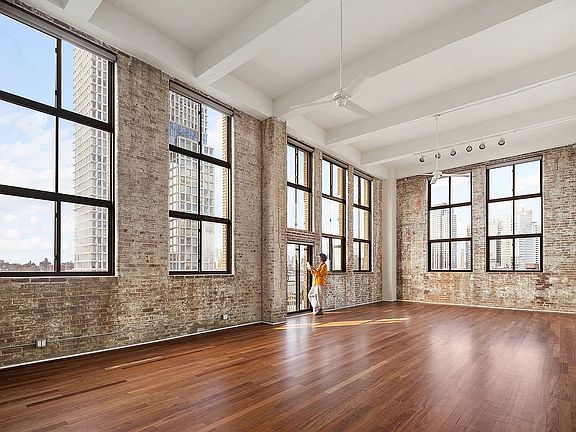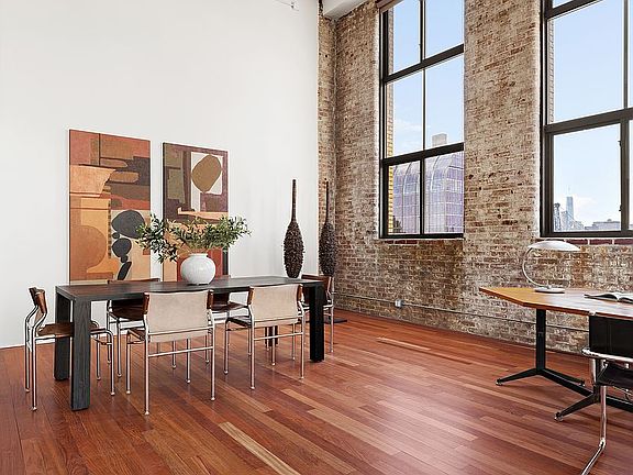 With impressive 18ft ceilings and massive windows facing West and North, this corner unit at The Esquire brings the Williamsburg waterfront & the Manhattan skyline to your doorstep. Featuring majestic proportions and authentic details, complete with a Juliet balcony and sunset views over the East River and Domino Park, this loft is one of the most spectacular and unique spaces on the market. Exposed brick and cast concrete ceilings speak to the building's industrial history, while pristine Brazilian hardwood cherry floors lend warmth and depth to the space. The large, newly renovated open kitchen leads into the great room, and is complete with brand new stainless steel Bosch appliances, Zimbabwe black granite countertops, and plenty of storage space. Tucked behind the open kitchen, one finds a giant pantry with a stacked washer/dryer. Bathed in western and northern light, this ~2,000 square foot duplex loft offers complete flexibility in terms of layout. Currently configured as a 1 bedroom, this loft can be transformed into a 2 bedroom or 3 bedroom home. With a full bathroom on each level, the upper level is a natural primary suite, with 2 closets. An easy extension to the second floor space may be added for additional bedrooms. Dual-zone central air conditioning completes the offering. The Esquire Building, one of the only remaining original loft buildings in Williamsburg, is a former shoe polish factory that was converted to condos in 2002. Each loft space in the building is unique, offering owners low monthly carrying charges, a rooftop terrace, geothermal climate system, small gardening plots, a composting center, pet washing room, video intercom entry, and the convenience of a live-in superintendent. The building is located just a block from Domino Park and is just moments away from the best restaurants, bars, and shopping in Williamsburg. There is currently a monthly assessment for $410.