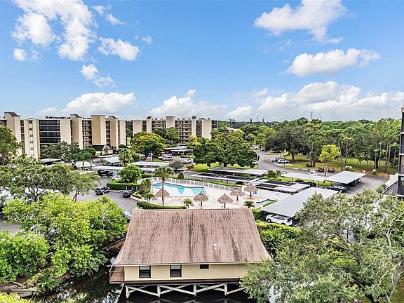 The view truly takes the cake in this stunning top-floor condo overlooking the 9th fairway of the Cove Cay Golf Course and the sparkling waters of Tampa Bay. From the moment you arrive, you’ll enjoy a front-door view of the Village 4 pool and all the amenities this ever-popular community offers. Then you will step inside to an updated kitchen featuring custom wood cabinetry, gleaming granite counters, stainless steel appliances, track lighting, and a cozy eat-in nook. The spacious living and dining area showcases engineered hardwood flooring and opens to a fabulous PGT sliding door wall. From here, step out to the expansive screened lanai where that spectacular golf and bay view will never get old. The master bedroom also enjoys upgraded sliding doors to the lanai, extending the scenery right into your private retreat. Both bathrooms were completely remodeled in May 2024 with new tile, sinks, toilets, and finishes for a fresh, modern feel. Bedroom closets feature built-in organizers, and additional updates include a newer water heater (approx. 5 years) and a washer installed in 2024. A rare opportunity to own one of the best views in Cove Cay—move-in ready, tastefully updated, and perfect for enjoying the Florida lifestyle. Lush grounds, gorgeous ripples of Tampa Bay’s sparkling waters, an available 18-hole championship golf course with full restaurant and bar open 7 days a week, a full marina available for your boating pleasures, and 24 hour security make this the Paradise known as Cove Cay