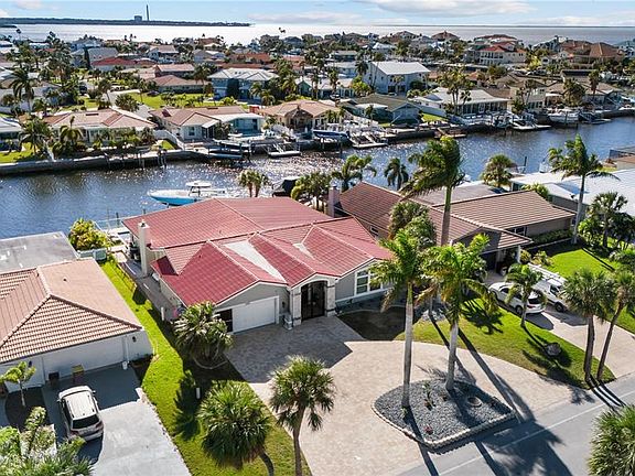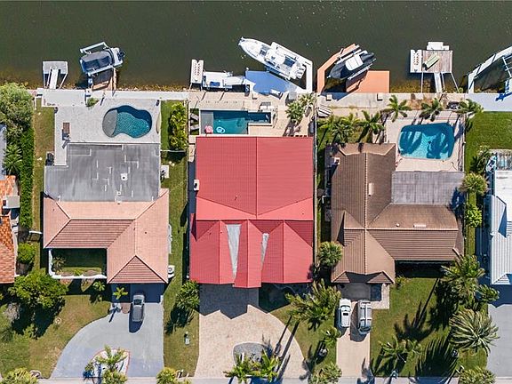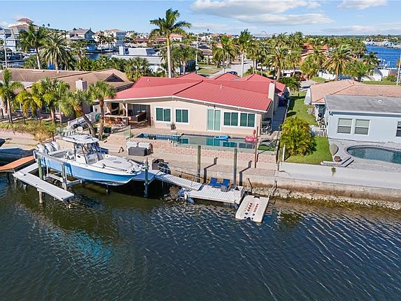 Experience refined coastal living in this 4-bedroom, 3-bathroom waterfront, pool home plus bonus billiards/game room. Completely remodeled after Hurricane Helene by a licensed contractor with all permits closed, this residence combines modern design, functionality, and peace of mind. The executive kitchen features over 80 all wood custom cabinets/drawers, convection microwave, wine fridge, and elegant custom walnut accents. The entire home has a water filtration system and kitchen includes water osmosis system. Luxury vinyl flooring runs throughout most of the home, while the primary suite offers a spa-level retreat with a rare Brazilian marble countertop (one of only five slabs in the world, featured on HGTV), commercial-grade steam machine and marble tile from floor to ceiling. The second bathroom also features the same countertop with marble flooring and marble tile in the shower area. Outside, enjoy breathtaking sunrise and sunset views from your private oasis featuring a 10,000 lb boat lift, floating dock, jet ski dock, fish-cleaning station, and covered entertaining space with fireplace and wine fridge. The canal is not only wide, it is also 28ft+ deep, allowing for many neighbors to have yachts/sailboats/catamarans. So bring your yacht! Additional features include: • Metal roof (tile-look) • AC units (2020 & 2024) • Tankless water heater • Pool heater/chiller • Outfitted with impact windows, doors and sliders Optional memberships to a private beach club and local civic association provide access to farmers markets, concerts, and community events, giving you the luxury of a connected lifestyle without high HOA fees. This home is only 5 houses down from the beach, making it one of the best locations in the neighborhood.