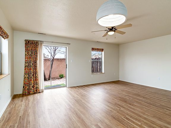 Welcome home! Located in the gated community of Plaza Encantada, this lovely two-bedroom, two-bathroom home is move-in-ready! The living/dining/kitchen is open and airy; the natural light is abundant throughout the unit. New paint, new flooring, new kitchen appliances, new stucco, roof maintained in 2023, refurbished kitchen cabinets, updated bathrooms, and newer water heater. There is one garage space and two dedicated parking places per condo, plus guest parking in the main parking lot. Enjoy the outdoors on the gated, beautifully landscaped patio. The Condo Association maintains stucco, roof, and gate. Conveniently located near all your big box stores, grocery stores, restaurants, and hospitals, and easy access to I-25 and 599 Santa Fe's North and South Routes. HOA dues paid through the end of 2025! Take advantage of this great opportunity!