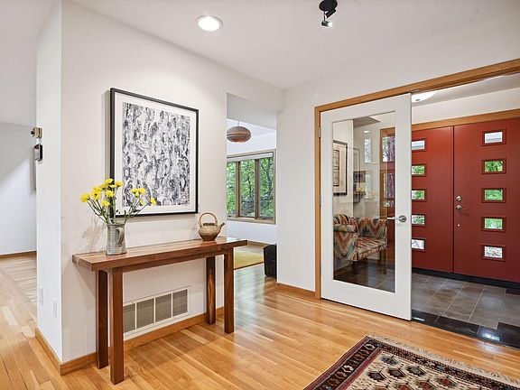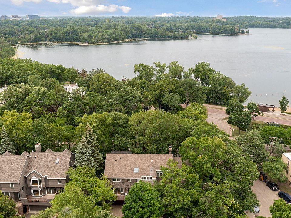 Spectacular wooded setting on a large lot just steps from Cedar Lake, its beaches and paths, for a wide variety of waterfront and outdoor activities. A custom home designed by the original architect owner with thoughtful spaces throughout for daily living, entertaining, enjoying the outdoors throughout the seasons, relaxing, and working from home. Modern conveniences include a large primary suite with two walk-in closets and en suite full bath, two separate home offices, two main level bedrooms with a shared en suite bath, a four-car attached garage, a workshop, and dog wash. A separate lower level one-bedroom apartment with its own living spaces and laundry offers space for family, guests, a nanny/caregiver, or renting to tenants. Multiple outdoor spaces include a wrap around deck with lake views, a bedroom balcony, a primary suite screened-in porch amongst the trees, and two patios. Easy commuting. Walk or bike to dining, shopping, cafes, and multiple city lakes!