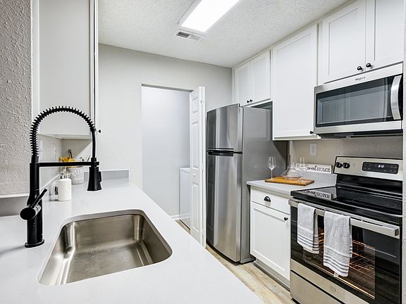 Emerald Renovation: Our Emerald renovated apartment home includes serene gray wall paint, Stainless Steel appliances with a microwave and refrigerator with icemaker, white cabinets, and quartz countertops with an undermount sink. Enjoy gray vinyl plank flooring in the kitchen and living area(s) with plush carpet in the bedroom(s). Apartments have a matte-black hardware package, USB outlets, upgraded lighting, and two-inch white faux wood blinds.