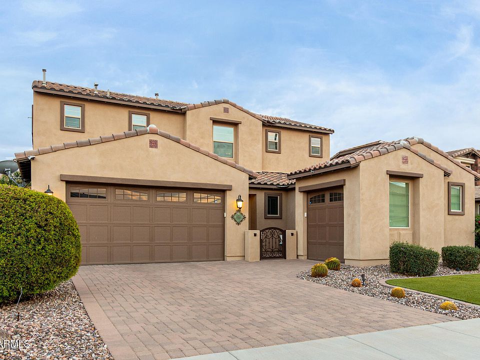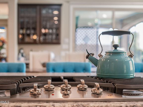 Welcome to Marbella Vinyards located in Gilbert, Arizona. This stunning property resides in one of the hottest zip codes - 85298. This home is 100% move-in-ready and highly upgraded inside and out. From the moment you arrive, you will love the curb appeal. You will instantly notice the perfectly manicured lawn, 3-car garage, courtyard and stunning entry door. Upon entering the home, you will get all the feels - it's elegant, sparkling clean, bright, big and beautiful. A full bedroom and bathroom are downstairs - making a great spot for guests. Gather at one of the biggest kitchen islands you have ever seen. The backyard oasis feels like a luxury resort. Relax and enjoy a show inside the professionally screened in patio, BBQ under the Alumawood pergola, soak in the bubbling spa or take a swim in the inviting pool. There are multiple water and fire features and most everything lights up at night.