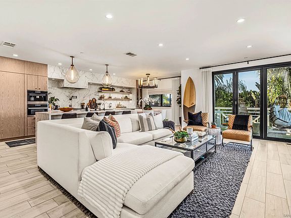 Experience refined coastal living in this exquisite luxury townhome, perfectly situated just one block from the beautiful beaches of Carlsbad. Built in 2017 and meticulously remodeled with high-end finishes and designer details in 2021, this lightly lived-in residence offers a pristine, turnkey opportunity for even the most discerning buyer. Ideally positioned to capture refreshing ocean breezes without harsh afternoon sun, this home delivers both comfort and sophistication in a prime coastal setting. The entry level features direct access from the attached two-car garage, two bedrooms, and a full bathroom—ideal for guests or a home office. Upstairs, the open-concept main level showcases a stunning fireplace, large picture windows that fill the home with natural light plus Cantina doors that open to create seamless indoor outdoor living, recessed lighting, and a striking staircase with glass accents. The chef-inspired kitchen is sure to impress, offering a generous eat-at center island illuminated by pendant lighting, ceramic slab countertops, open shelving, and abundant cabinet space. This level also includes a bedroom with en suite bath and a convenient half bath. The top floor serves as a private retreat, a serene primary suite featuring peak ocean views, a huge custom walk-in closet and spa-like bathroom—complete with a deep soaking tub, large step-in shower, dual vanities, and elegant designer finishes. Views of the Carlsbad sign are enjoyed in the primary bath. Sold Fully Furnished… All You Need to Bring Is Your Toothbrush (and Maybe a Bottle of Champagne). Multiple outdoor living spaces provide the perfect spots to unwind and enjoy the coastal air. Just minutes from Carlsbad Village’s lively cafes, boutiques, and train station—with easy access to the I-5—this rare coastal gem seamlessly combines modern elegance, thoughtful design, and the best of the Southern California lifestyle.
