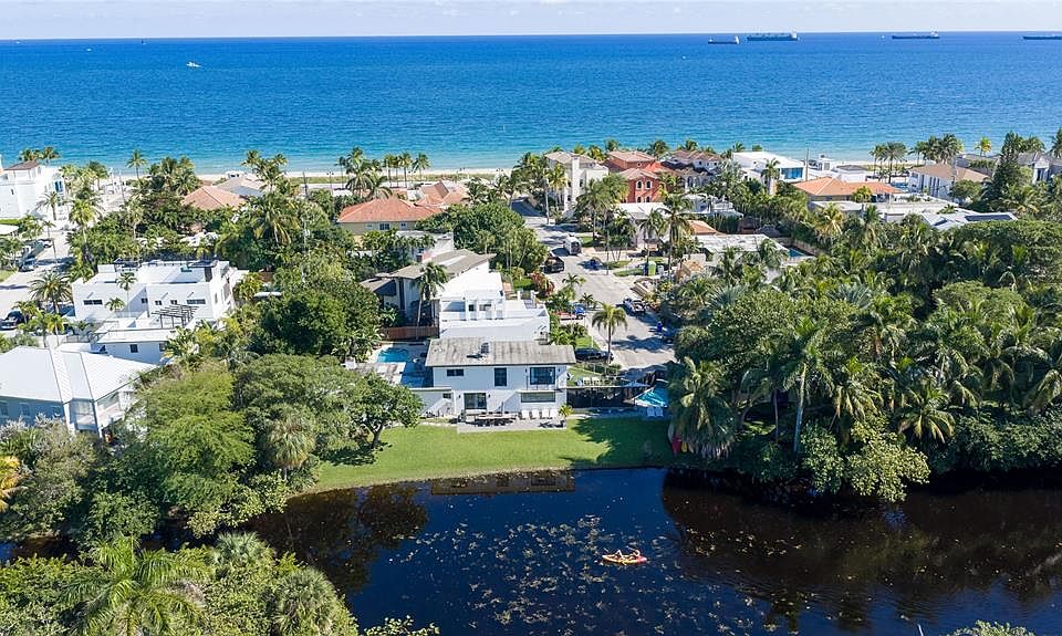 Prime location one block from Fort Lauderdale Beach and steps from Birch State Park. This two-story waterfront home sits on a quiet lagoon with direct paddleboard access, offering a rare blend of beach convenience and private retreat. The 5 bed 4 bath main home plus a 1 bed 1 bath guest suite creates flexible living for multigenerational needs, guests, or added income. Mid-century modern style, open living areas, a screened porch, an upper deck off the primary suite, and a heated saltwater pool elevate everyday living. Approved as a vacation rental with strong income potential, the property delivers comfort, access, and a lifestyle that is hard to match. WATERFRONT IS NOT OWNED BY HOMEOWNER. Waterfront Lagoon is part of Birch State Park Property. You can launch paddle boards and canoes.