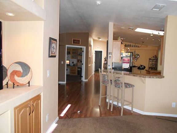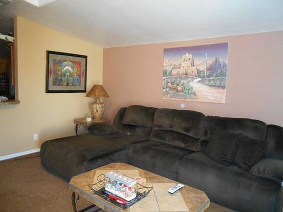 This lovely Cavco, La Cantania home is a must see! This partially furnished 2 bedroom 2 bathroom, plus a den AND a screened in AZ room home is placed on a large lot! As you walk in this home you are greeted with a large living room with a built in entertainment center that has been remolded to fit a tv of any size, bright dormer windows, a bay window, and a open view of the rest of the home! The formal dining room is large and will easily accommodate a big group. The informal dining room isn't anything short of spacious either! The kitchen is open and comes with all electric appliances which include, a 3 month old french bottom refrigerator, glass top stove with a triple burner for grilling, built in microwave, garbage disposal, dishwasher, washer and dyer. In the kitchen we have a breakfast bar, lots of storage, and slide out shelves in cabinets. The home has extra storage closets throughout the home! The den has beautiful double doors that open up to the large room with wall length built in desk and shelving, it could easily accommodate a day bed for extra room for guests. The guest bedroom is spacious and has a large closet for storage, the guest bathroom is clean and spacious. The den has a built in shelving unit with a built in desk! The master bedroom has a walk in closet and a master bathroom connected to it, the bathroom has a large garden tub, walk in shower, private toilet, and storage closet! There is laminate flooring and carpet and all window treatments stay. The outside of this home is perfect for this Arizona weather, a storage shed with industrial shelving and electric! The entire Arizona Room which is 312 sq. ft. has been enclosed with amazing windows that open and are removable, they slide open vertically from top to bottom or bottom to top and there is a patio outside of the Arizona room that is covered but not enclosed. The carport has been converted into a LARGE garage, this garage can easily accommodate 2 cars and the golf cart that comes with this home! Call today to see this super charming home. The home is located in a 55+ Active community. Enjoy the amenities of a resort style pool and Jacuzzi, fitness room, billiards, library, card room, shuffleboard, organized events and so much more! EHO, certain restrictions may apply. www.aznestfinders.com