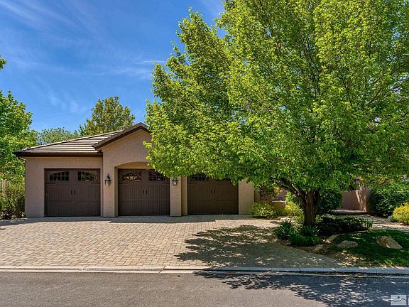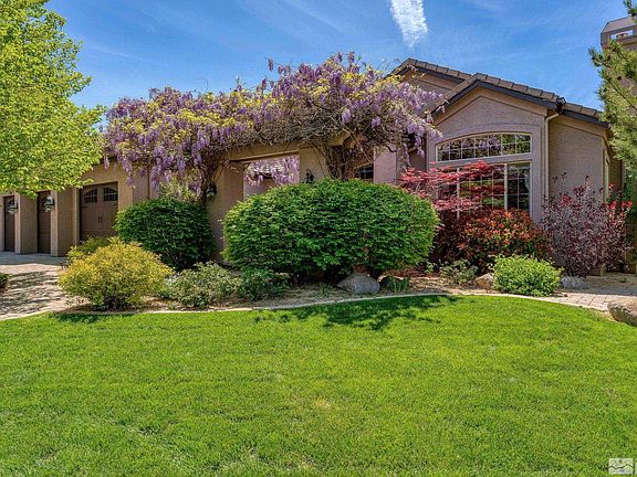 Are you looking for a home with less maintenance? Mountain views? Single floorplan with 3 car garage and near walking trails? Congratulations, you found it! From the moment you drive up, this Caughlin Ranch home makes a statement from the stunning blooming flowers to the sweeping views. Beyond your paver driveway, enjoy a floor plan that makes for great day-to-day living and entertaining. Stretched archways and impressive windows make airy interiors feel especially bright., In addition to a family room and living room (both featuring fireplaces), you'll find a formal dining area with ornamental chandelier, hardwood flooring, and a spacious kitchen showcasing a massive island, granite countertops, double-stacked wall oven, large sink, and pantry. The primary suite connects to a sizable tiled bathroom that includes dual sinks, comfortable soaking tub, glass-enclosed shower, and tasteful gold accents. The laundry room has ample cabinetry, utility sink, and counter space. Outside, discover a partially-covered back deck and lush backyard with picturesque views and delightful foliage. 3-car garage has one separated bay (currently used as a workshop). A truly splendid home indeed!