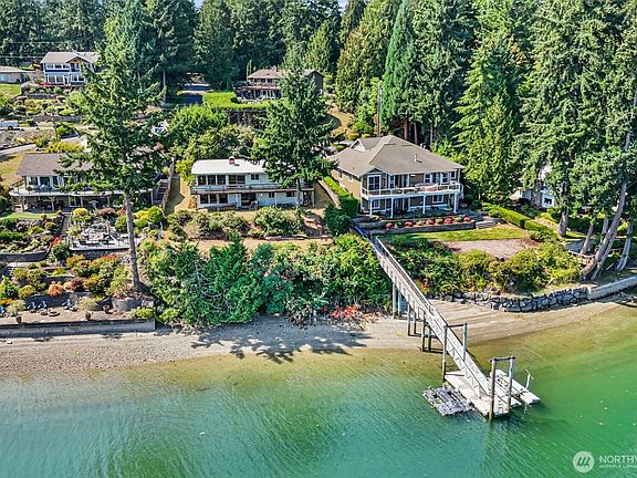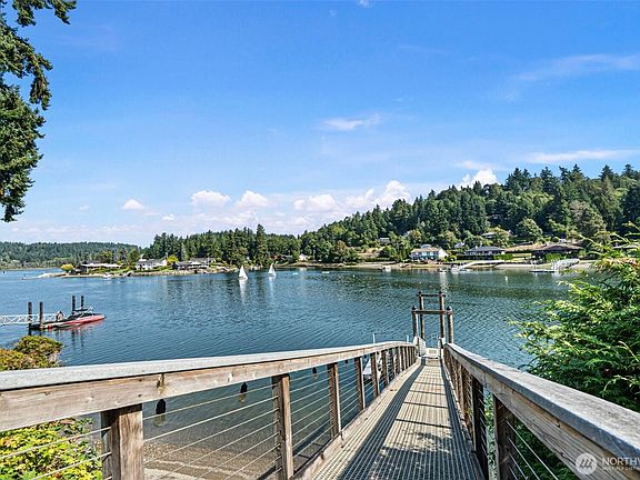 “Heaven is a little closer in a home by the water”. Discover your waterfront escape on Wollochet Bay! Enjoy stunning views of Mt. Rainier, abundant wildlife, and easy access to the water. The shared dock, 85 ft of wft, and a community boat launch close by, are perfect for any paddleboard, kayak, or boating enthusiasts. Styled with character, walls of windows fill the mid-century interior with an abundance of light and views that won't disappoint. The home's layout lets you live comfortably on the main level yet gives you added space on the lower level for guests, a studio, workout space or cozy family room retreat. Let your imagination soar and your creativity blossom as you make this home your own and settle into the waterfront lifestyle!
