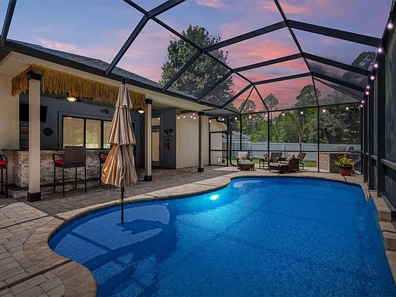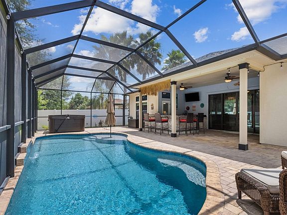 Live like you’re on VACATION every day in this stunning 3-bedroom retreat! Sitting on a quiet preserve and private cul-de-sac, this beautiful home offers all the amenities, including a sparkling pool (Ozone), outdoor bar decorated with stack rock and leather granite counter tops and a taste of Margaritaville. Walking out the lanai you will find the built-in outdoor grill and beautiful landscaping. This extraordinary home offers an expansive open floor plan that blends the indoor and outdoor spaces effortlessly. Upon entering the home, there is an office on the right and on the left, you will step into the dining room, that features plenty of natural light with a double-trey ceiling. The dining room opens directly to the updated gourmet kitchen with quartz countertops and features an oversized island for meal prepping, stainless steel appliances and a breakfast bar for entertaining guests and family. The large Great Room has an electric fireplace, a shiplap wall with double sliding doors leading out to the patio with the calming sound of the pool. The large primary bedroom has a high double trey-ceiling and a private door leading out to the lanai. The master en-suite bath has double sinks, shiplap walls, soaking tub and separate shower. On the opposite side of the house, you will find two oversized guest bedrooms separated with a custom barn door for added privacy. One bedroom has its own bath with private access to the lanai and pool. Whether you’re hosting poolside parties or enjoying quiet evenings under the stars, this home delivers the finest in one of Florida’s most desirable locations. New HVAC was installed in 2024. Schedule your tour today and see what else there is to offer in this stunning home.