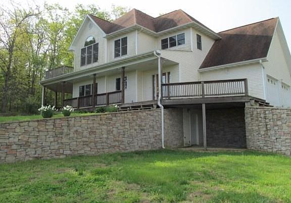 Custom built vinyl sided 2 story contemporary 3 bdrm, 2 bath home on 3.03 ac with beautiful view of the countryside just at the edge of town with full unfin bmst that is stubbed for additional bath. Master bdrm features cathedral ceiling, rock FP and opens onto balcony with walk-in closet in M bath. LR features rock fireplace and opens onto the wrap deck. Kitchen has nice oak cabinets, stainless appliances, breakfast bar and tile flooring. 1 pond, garden spot, paved drive, public water, paved road frontage. This is a FannieMae HomePath property.