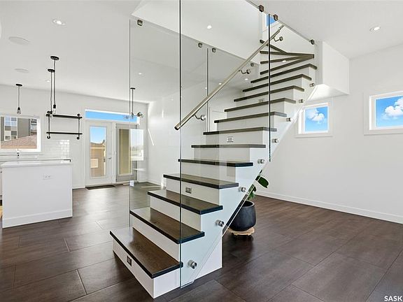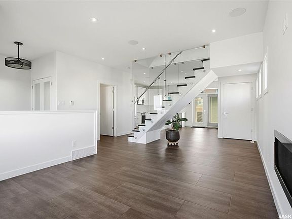 Modern glass-walled staircaseGas fireplaceBuilt-in surround soundCustom kitchenSpacious islandSubway tile backsplashVaulted ceiling