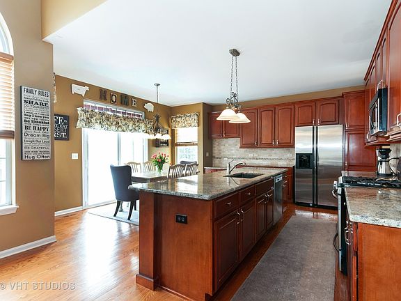 Beautiful "Executive Series" home with finished walk-out basement in Geneva! Brick front exterior w/stamped concrete walkway & entryway. 2 story expanded foyer welcomes you to this 4 bedrm, 3.1 bathrm home w/all the bells & whistles. Open floor plan for family gatherings or entertaining. Formal living rm w/bay & dining rm w/cr molding. A cooks dream kitchen w/granite counters, SS appl, abundance of 42" cabinetry plus breakfast area. Opens to soaring family rm w/beautiful granite fireplace w/wood above. Den w/ adjacent full bathrm. Laundry rm. New spindle staircase leads to 2nd fl featuring hardwood hall. Grand, vaulted master bedrm retreat w/private balcony. Master bath w/dual vanities plus soaker tub/separate shower. 3 ample sized bedrms w/ceiling fans. Hall bath w/dual vanity. Finished walk-out w/granite bar, fam rm, exer rm & bath. Prof landscaped yard w/2 tier deck. 3 car garage. Great location near Geneva Commons, minutes to Geneva, Metra & more! Elem. school in sub. Fall in love!