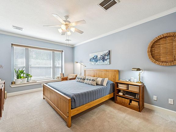 Very popular Village Builders Louisville plan,5/3.5/3D with Primary Bedroom down, game room and 4 bedrooms up on a large corner cul-de-sac lot.  Kitchen boasts stainless steel appliances and Avanza counter tops. Beautiful back pergola on oversized back patio that has a drainage channel to the street,  primary bath features jetted tub, frameless shower with taller glass, study has French doors and a wall of built-ins, and plantation shutters.  Huge den with two story cathedral ceiling, custom built-ins, tile flooring.   Full 3 car detached garage (with metal half fence at walkway), and MDF siding on walls with Maple cabinets. Hurricane wood covers for all windows are cut to size with clips. Home features split staircase, kitchen open to den, oversized entry foyer, two ceiling entry, and much more!