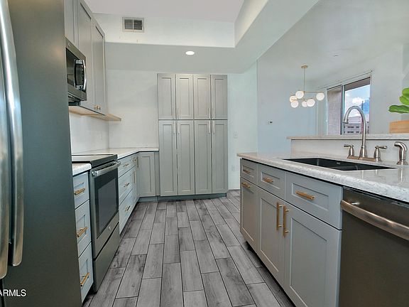 Location, Location, Location! This beautifully remodeled unit is perfect for everyday living or for seasonal enjoyment. An open and bright floor plan greet you as you enter this charming living space. The fully updated kitchen is well equipped with plentiful gray shaker cabinets, pantry, quartz counter tops, stainless steel appliances, all while overlooking the main living space. The primary ensuite is highlighted with a remodeled bathroom space, and custom storage shelves can be found in the walk-in closet. Newer wood style tile floors compliment the neutral color palette. New water heater installed May 2025. Enjoy entertaining at the sparkling community pool and BBQ nearby. This home is located in the heart of Phoenix just minutes away from professional sports, restaurants, shopping, and easy freeway access. Welcome Home!