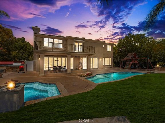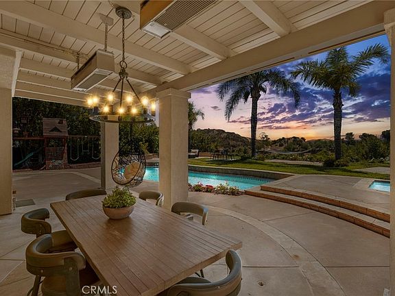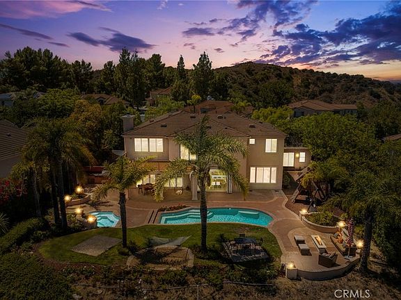 Set within a prestigious, guarded, and gated community high above the valley, this estate offers sweeping, unobstructed views of the Santa Monica Mountains and year-round indoor-outdoor living. You’re just minutes from Malibu, world-class equestrian facilities such as Fair Hills Farms, top-rated schools, premier golf courses, hiking trails, private country clubs, and the vibrant Calabasas lifestyle. Custom iron front doors open to a formal living and dining room where soaring double-height ceilings and dramatic mountain vistas create an immediate sense of openness and refinement. On clear days, Catalina Island peeks on the horizon. The chef’s kitchen anchors the heart of the home, featuring white shaker cabinetry, granite countertops, premium stainless steel appliances, and a central island. A full wall of custom folding glass doors opens this space and the adjoining living room to the outdoors, blurring the line between interior comfort and the panoramic landscape. The backyard is built for year-round enjoyment and memorable gatherings. A saltwater pool and spa, a fireplace, built-in BBQ, covered porch, mature trees, and recently landscaped gardens create a private resort for relaxation and entertaining. The now fully irrigated lawns, fruit trees, and native plantings foster a serene and welcoming atmosphere. The flexible main floor layout features a spacious guest suite with an ensuite bathroom, plus two flex rooms that are ideal for a media lounge, home gym, workshop, office, or playroom. A powder room, dedicated laundry area, and multi-car garage finish the main level. Upstairs, the luxurious primary suite spans the length of the house, including a private balcony overlooking the mountains, a versatile office or gym enclave, a newly renovated primary bathroom, and a dual-sided walk-in closet. Three additional bedrooms each feature private baths - one with a steam shower for added comfort and privacy. Integrated smart home technology, patio heaters, surround sound, EV charging, and a new HVAC system ensure comfort and modern convenience. Whether hosting friends, relaxing in nature, or taking advantage of minutes-away golf facilities, horse facilities, and trailheads, this property offers unmatched value for its blend of location, amenities, and lifestyle. Schedule a private tour and experience the lifestyle this estate can deliver.