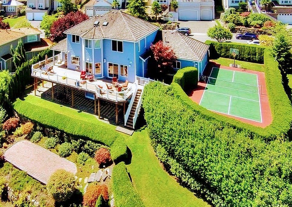 Exquisite home in desirable Stone Brook, Surrounded by 180 degree views of Puget Sound, Mt Rainier and Seattle. Beautiful home features an abundance of gorgeous finishes including a completely updated kitchen with granite counter tops, coffered ceilings, new iron staircase, tile, extensive hard woods, new carpet, new paint, updated baths, dog wash in garage and finished basement w/ MIL potential. Featuring amazing outdoor spaces with sport court, trek deck, patio, and beautiful terraced yard.