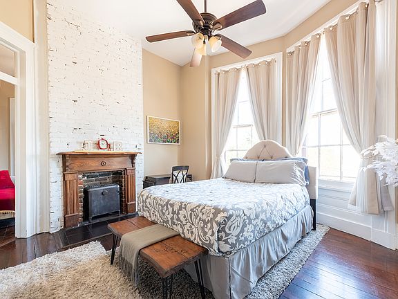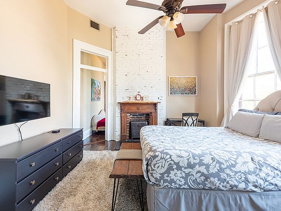 With a great view from the 2nd floor through 8' bay windows, the Jazz & Blues Suite features a queen bed, full kitchen/dining room, full bathroom (1 clawfoot tub/shower), a Smart-TV, central air/heat, ceiling fans. Only the entrance foyer on the 1st floor and the 2nd floor laundry room spaces are shared with other guests. Wi-fi, gas and water included.