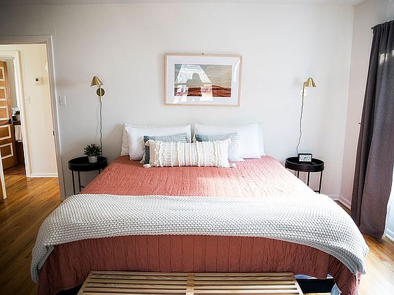 This brightly-lit home is on a quiet, tree-filled street in the popular Cherrywood neighborhood in central East Austin. It has hardwood and saltillo tile floors, an oversized master bedroom, a completely remodeled bathroom, a roomy kitchen with a colorful Mexican tile backsplash, lots of storage, stainless steel appliances, and a large front yard with native landscaing, a patio, and pergola custom built to hang hammocks from. Fenced back yard shared with tenant in garage apartment in back. There are bars, cafes, restaurants, and theaters within walking distance on Manor Rd., and it is blocks from the University of Texas, Dell Children's Medical Center, and Mueller. Close to the best of East Austin and Downtown. Cats and small dogs under 25 lbs only. $200 pet deposit.