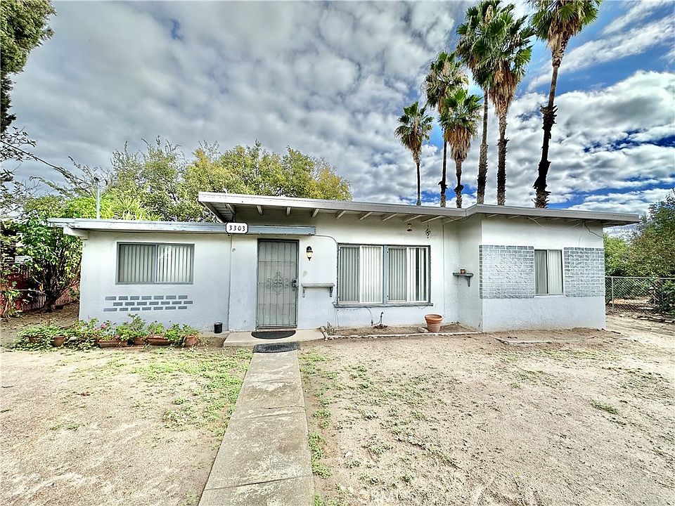 Charming single-story home in San Bernardino, blending timeless 1940s character with excellent starter-home value. This 2-bedroom, 1-bath residence features an open living area with tile flooring and exposed beam ceilings, leading into a bright kitchen ready for personal customization. Both permitted bedrooms offer laminate flooring, while the converted garage provides an additional living area and dining/bonus space — possibly unpermitted; buyer to verify. The bathroom has been thoughtfully adapted for accessibility with a spacious walk-in design. Recent updates include a 2025 electrical system upgrade (information provided by seller). The property sits on a generous 8,631 sq ft flat lot with an impressive collection of fruit trees, including three sweet orange trees, one sour orange tree, one lemon tree, one pomegranate tree, one mandarin tree, and one avocado tree. The backyard also includes two tool sheds and ample space for outdoor enjoyment. This home operates on a septic system and is equipped with a wall heater for comfort. A wonderful opportunity to own a vintage San Bernardino property with room to enhance, personalize, and grow.