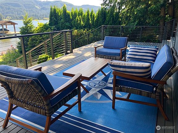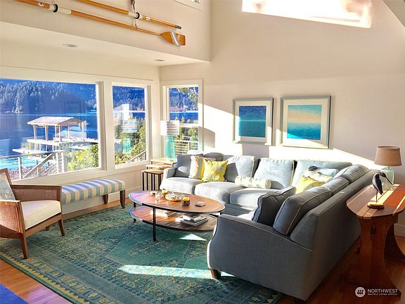 Lake Washington low bank waterfront home in a peaceful & private setting. Stunning southerly exposure looking down the lake at the island and magnificent foothills. Situated at the end of a dead end road and at the base of an extensive trail system. Sandy beach with a nice dock for moorage. Warm contemporary design with soaring vaulted ceilings and windows to enhance the view. Fabulous covered eck perfect for year round BBQ's & eagle watching. This is the best view on the whole lake!