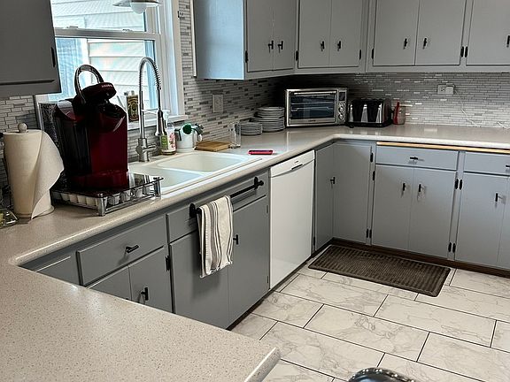 Quaint, absolutely adorable and ready to move -in, 3 bedrooms (one bedroom now a den) and 1 fully remodeled bathroom Ranch-Style house. This precious home is all brick except for newly added sunroom. It contains all New Soffits and Gutters as well as all New Windows on first floor living space area. Large comfortable Living Room/Dining Room with gorgeous laminated floors. Huge Repainted Kitchen with cozy eat-in area and ceiling fan/light has many, repainted Grey, extra deep spaced custom-made Birch wood cabinets with pull out drawers. Bright Kitchen also has composite counter tops, gorgeous porcelain tiled floors, almost new Borsch dishwasher, GE stove, and Amana refrigerator. An Overhead blower fan lays upward against a nice tiled backboard. New LED light over the sink along with a new, modern faucet accentuates the kitchen as well. Washer and Dryer are located on first floor next to the kitchen eat-in area which also has a separate pantry and utility closet. The stunning new vinyl- floored bathroom has the following special features-Extra High toilet and touch-less flush for ease of use along with a new vanity, new lighted mirror with built-in touch light, overhead light, and exhaust fan plus a big storage closet behind door. Solid walled shower has double shower heads and 2 grab bars. Second Bedroom with shades and curtains has hardwood floors, and a long, deep closet along entire side. Also, has ceiling fan too. The Master Bedroom can fit a king-sized bed easily. Also has curtains and shades, a huge, deep and long closet along its side wall, hardwood floors, and a ceiling fan with light. The Third Bedroom next to kitchen (now a family room/den) has a celling fan with light and a beautiful fireplace and 65" Sony TV (both can stay with home if requested). Adjacent through separate back door is a totally renovated, enclosed sunroom with double insulated inside walls, new vinyl siding outside walls and vinyl-sheeted floors. Behind the house lies a newly constructed (2022) Gazebo with added cement patio. A small extra garage acting as a shed in back of the 3/4 acre area has a garage type door with opener for tractors if needed!!! All landscaping was done by owner and back yard includes 3 growing beds with beautiful perennials and room for vegetables. Front of house has blacktop and new brick edging driveway and a brick sidewalk and stoop. The 2-car garage is extra long and full of storage space. Full partially finished basement has 3 sinks, brick (unused) fireplace, shower, newer sump pump and dehumidifier. House has septic tank -no sewer. Does have city water. Conventional loans or cash accepted only. All qualified offers will be reviewed.