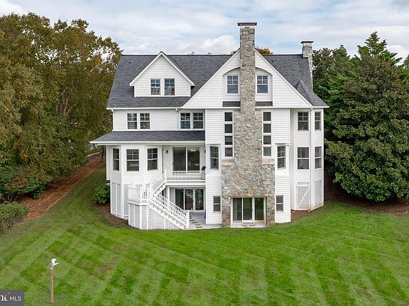 Glorious water views and incredible sunsets from this custom-designed, spacious home located in sought after, amenity rich Fishing Creek Farm. Move right in to this updated Victorian Farmhouse home with four finished levels of flexible living space, two magnificent 3-story stone chimneys plus a 3 car garage! The majority of the rooms are strategically designed to maximize dramatic water views and the property adjoins community waterfront open space. Original owners have recently remodeled the kitchen with quartz countertops and island offering a modern and stylish culinary space. Water views greet you in the Great Room with a dramatic stone fireplace, library/office with attached screened porch, family room, dining room, renovated kitchen. Main floor has two staircases, two powder rooms and laundry. Primary suite with elegant new primary bath with luxurious features includes porcelain tiles, a soaking tub, walk in shower, dual vanities and ample storage. Two additional bedrooms on the 2nd level with shared hall bath and new carpet. 3rd floor has two bedrooms, a hall bath, two bonus rooms, and plumbing for another full bath. Walk out lower level has high ceilings, a full in-law suite, a mini kitchen and laundry. Roof replaced in 2022, all 3 chimneys relined in 2023, the exterior and interior of the home was freshly painted in 2022/23, Carpets replaced and hardwood oak floors refinished in 2023.
