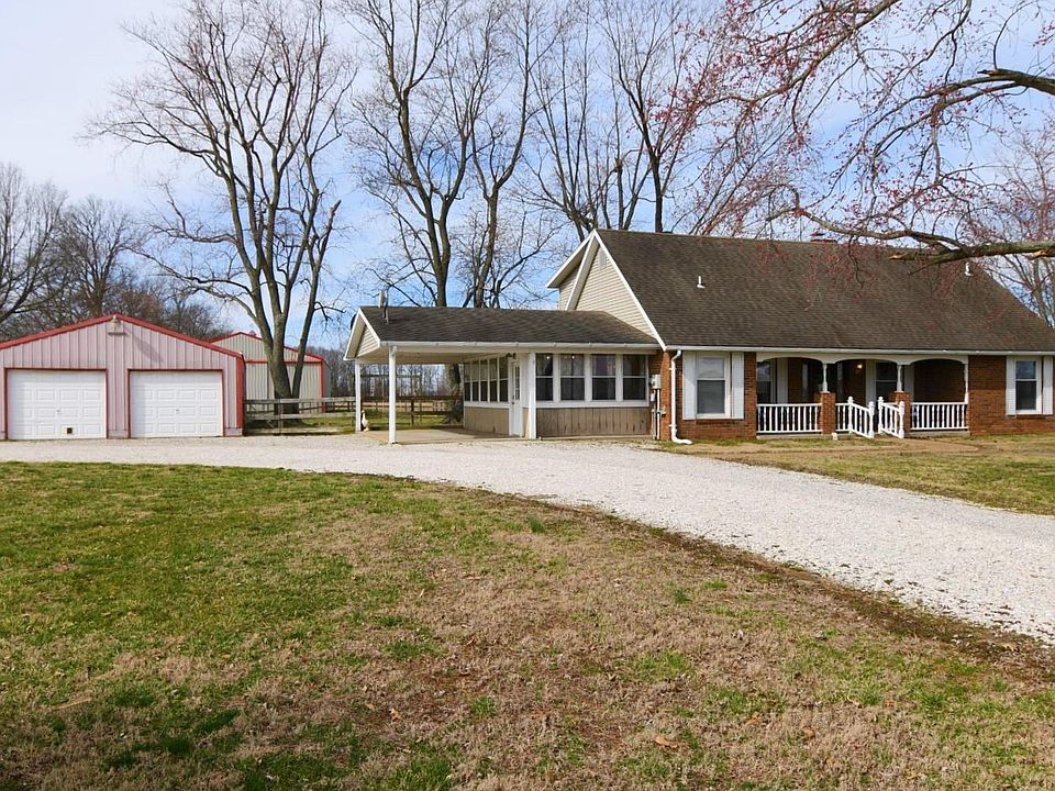 Welcome home to Country Living and all it has to offer. This brick 3 bedroom/2 bath home is ideally situated on 10+ acres that offers many opportunities. The covered front porch welcomes you in where you will find a main level primary suite with full bath, open concept remodeled kitchen, eat in dining opening to the living room with wood burner and a 3 seasons room (not included in sq ft) that provides great storage and work from home space. The upper level offers 2 bedrooms, one with a large walk-in closet providing great storage as well as full bath with double vanity. There is a 2 car detached garage as well as 40 x 80 Pole barn that could be used for horses on the pastured acreage with fencing already in place. There is also an invisible pet fence as well. Enjoy quiet evenings on the covered back patio off the dining space with views of the property.