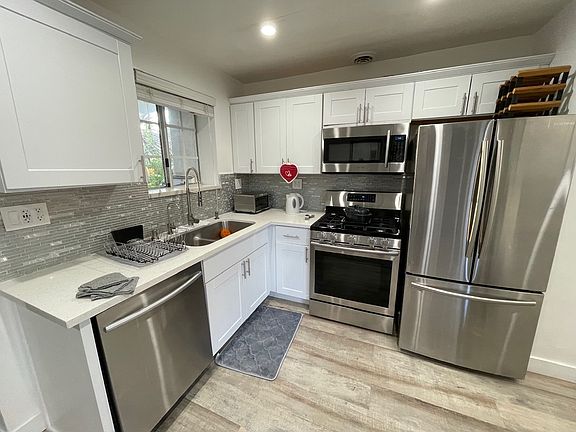 Newly updated two bedroom one bathroom home with plenty of closet space. Hardwood flooring though-out living area with tile in bathroom. Home is equipped with refrigerator, gas stove/oven, dishwasher, and laundry in unit. Eating area next to kitchen with Shaker cabinets and stone countertops. Entrance at front and from private backyard. Queen bed and mattress in one room, convertible futon in second room. Living room with sofa, coffee table, 50" wall-mounted TV. Walk-in shower in bathroom with floating vanity and a feature tile wall, and toilet bidet. High speed internet and all utilities paid. Mini split AC/heat in each room.