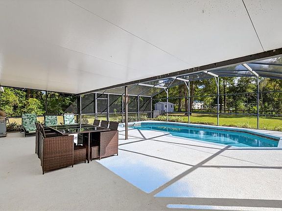 Welcome to 33043 Windy Oak Street, located in the sought-after Rolling Oak Estates community of Sorrento. This beautifully maintained home sits on more than an acre of lush, park-like land surrounded by mature trees and quiet countryside views. Inside, you will find a thoughtfully updated floor plan with inviting natural light and comfortable spaces throughout. The kitchen features marble countertops, updated 42-inch cabinetry, matte dark stainless steel appliances, and a peninsula that opens to the main living and dining areas, perfect for everyday living and entertaining. The primary suite overlooks the backyard and pool area and offers a private retreat with an elegantly remodeled bathroom, including a soaking tub, glass shower, and dual vanities. Three additional bedrooms and a second full bath complete the split plan design. The outdoor living space is the highlight of this property. Step out to a large screened lanai that opens to a sparkling in-ground pool and spacious deck area. The backyard provides ample room for play, pets, gardening, or simply enjoying the landscaped surroundings. A storage shed offers additional space for tools and equipment, and the fenced lot with gated access allows for secure parking of boats or recreational vehicles. Recent updates include a roof installed in 2022, windows replaced in 2021, and interior renovations completed in 2023, including flooring, lighting, kitchen, and baths. Every detail has been carefully maintained, offering move-in-ready comfort and lasting value. Set in a quiet neighborhood with low HOA dues and easy access to Mount Dora, Lake Mary, and major highways, this home combines rural tranquility with modern convenience.