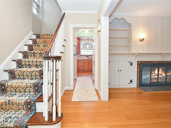 Step into the inviting living area, where a striking fireplace creates a warm and welcoming ambiance. The elegant dining room features a large bay window with French doors overlooking a newly rebuilt stone terrace, seamlessly blending indoor and outdoor spaces for effortless entertaining. The eat-in kitchen includes solid wood cabinetry, granite countertops and stainless-steel appliances. A convenient first-floor powder room completes the first floor. The second floor hosts a spacious primary suite with two closets and an ensuite bath adorned with beautiful, tiled floors. Two additional bedrooms and a hallway access to the bath provide ample comfort. The fully finished third level offers a versatile fourth bedroom and an updated full bathroom. The lower level includes a partially finished recreation space, plentiful storage, laundry area, and modernized mechanicals. A detached two-car garage, dual-zone heating and cooling, and handsome hardwood floors make this property move-in ready, with room for personalization.