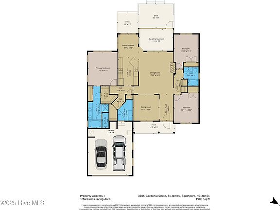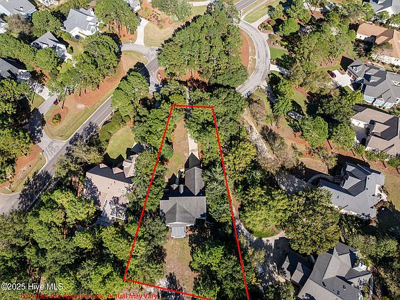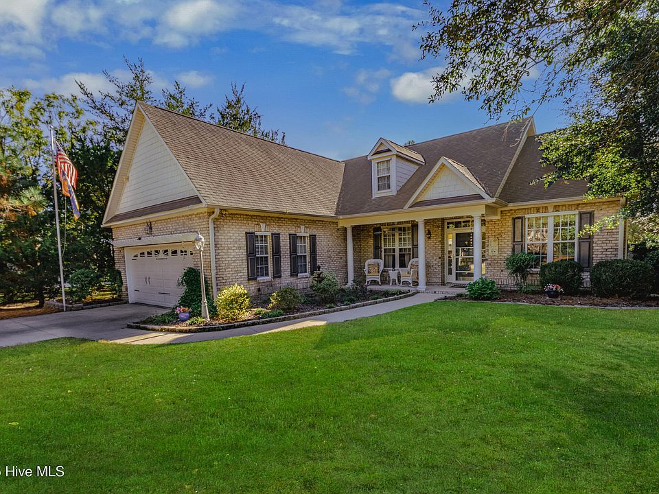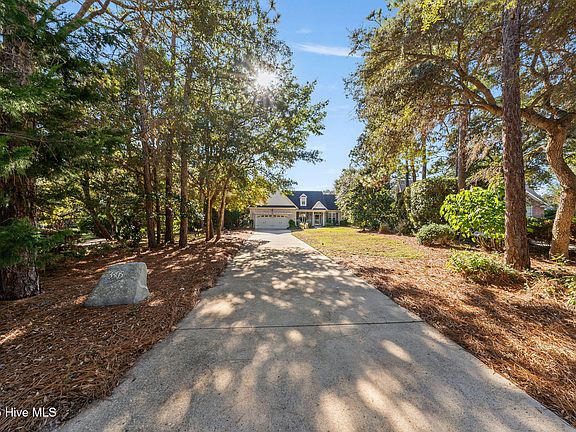 Privately situated on a half-acre wooded home-site that offers maximum privacy, this appealing one story living home that exudes warmth and character in the popular neighborhood of St. James Plantaiton. A tree lined, driveway leads to the double garage, beautifully accented with an eyebrow pergola, while a paved walkway, bordered by quaint landscaping, leads to the welcoming front porch. Inside, this thoughtfully designed 1,900-square-foot home features a comfortable three-bedroom, two-bathroom layout with a desirable split-bedroom design, providing both privacy and functionality for everyday living. Step inside and be greeted by a bright and cheerful foyer that sets the tone for the home's inviting character. Custom wainscoting, chair rail molding, and engineered hardwood floors flow seamlessly through the main living areas, including the elegant formal dining room, which is enhanced with picture rail and crown molding. Wide cased openings topped with open transoms connect the dining room to both the foyer and great room, allowing natural light to travel effortlessly throughout the space. The great room impresses with a vaulted ceiling and a gas fireplace framed by a beautifully detailed surround and mantle featuring dentil molding and millwork. The adjacent kitchen features abundant cabinetry, solid-surface countertops, a built-in desk area, and a tiled backsplash. A gas stove, recessed lighting, and a cheerful breakfast nook complete with continued trim detailing and a tropical ceiling fan add to the kitchen's appeal. Just beyond, the sunroom provides a relaxing retreat with durable LVP flooring and peaceful backyard views. Step outside to enjoy the open back deck with a retractable awning or the quaint paver patio below. Bordered by mature trees, the backyard feels like a private sanctuary perfect for quiet mornings or casual gatherings with friends and family. The private owner's suite is a warm and inviting retreat, featuring hardwood flooring, abundant