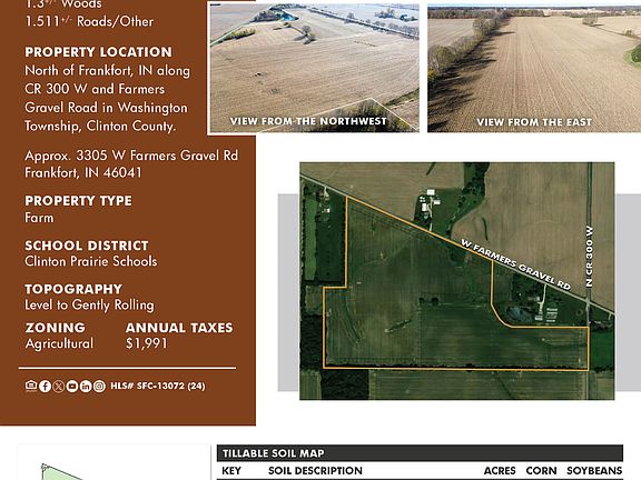 Quality tillable cropland available. Located just north of Frankfort is this very nice, mostly tillable farm. For purchase is 60.106 total acres (recently surveyed) with an estimated 57.8 tillable acres, 1.3 wooded acres, and 1.511 non-tillable acres. The farm includes 1595 feet of frontage along Farmers Gravel and 422 feet of frontage on CR 300 West. Great opportunity for farmland investment or potential to acquire acreage for possibly building your dream home and mini farm. Farm open to lease for 2025.