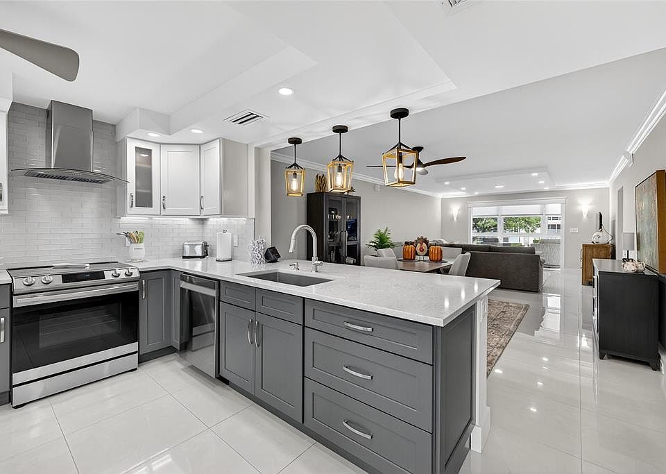 Oversized gray granite sinkMatching upgraded quartzImpact windows and doorPrivacy patio shades