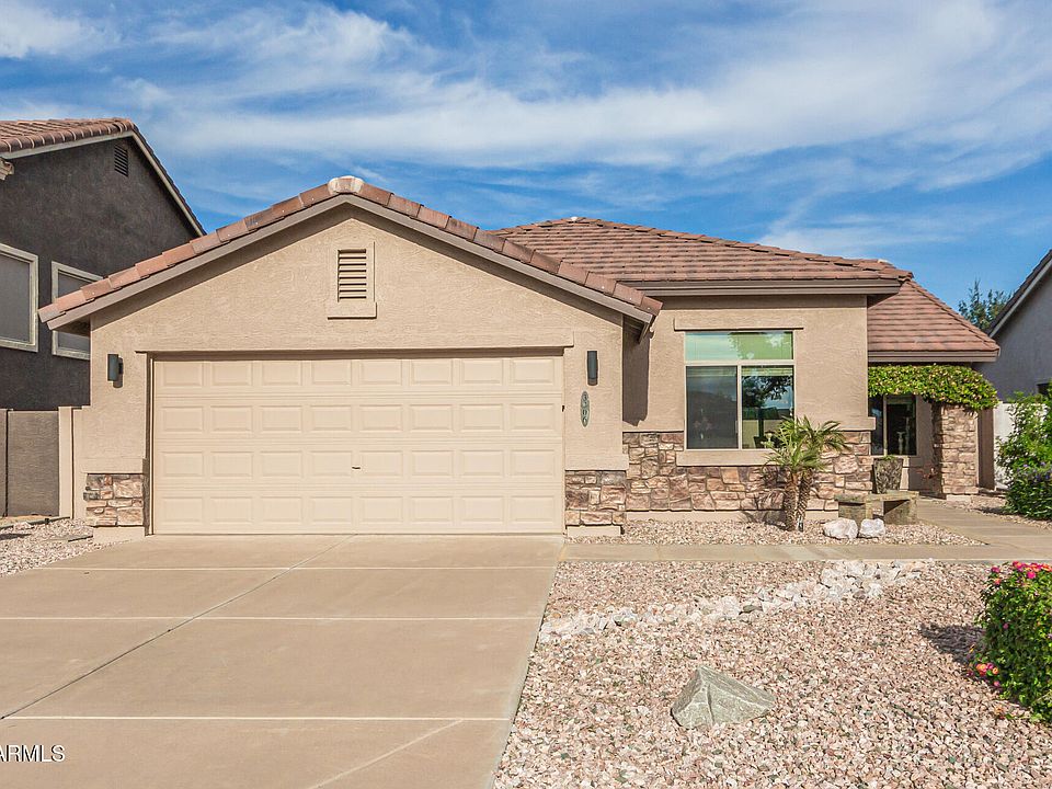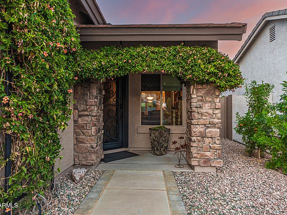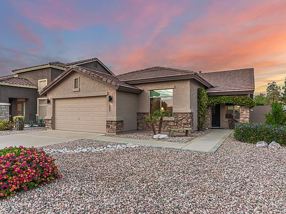 Gorgeous single-story home in San Tan Ranch! This beauty boasts charming curb appeal with a stone-accented facade, a new roof, new security door and a 2-car garage. The interior showcases NEW wood-look flooring, new windows, vaulted ceilings for a feeling of openness, abundant natural light, a fireplace in the living room for cozy winters, and two-tone paint. The well-appointed kitchen is equipped with staggered cabinets, tile backsplash and countertops, stainless steel appliances, and an island. Get a restful sleep in the main bedroom, offering a bathroom with double sinks, a walk-in closet, and a private exit. The den is perfect for an office. The backyard is complete with a cozy covered patio ideal for morning coffee, a hot tub, and a relaxing landscape with grass and raised planters.