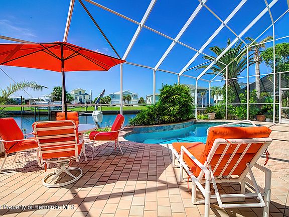 Live Your Dream of Coastal Living! Welcome Home to this spectacular custom-built, 3-story, waterfront pool home offering direct access to the Gulf of Mexico in Hernando Beach, Florida. With water views from practically every room, this boater's paradise sits on a lusciously landscaped lot within minutes of the open water! Arrive at this one-of-a-kind home on the paved circular drive and enter through the beautiful leaded glass double door entrance. Hop on the elevator to the second floor or visit the resort-style rear patio with heated, self-cleaning, salt water pool and large hot tub, enclosed in a two-story vaulted screen room. With a total of over 5,000 square feet under roof and 2,347 square feet of indoor living space including 2 bedrooms, 2 bathrooms, PLUS a flex room which can be used as a den, study, home office or guest space, this home also includes a 200 square foot open loft area complete with Gulf water views from a peaceful, private balcony. Step out of the elevator into the impressive great room which boasts a towering 20-foot ceiling, a cozy gas fireplace, Bose surround sound, beautiful ceramic tile floors, a separate dining area, and a well-appointed open concept kitchen with Corian countertops, custom solid wood cabinets (69'' upper cabinets), Samsung stainless steel appliances, reverse osmosis water system, pantry, and a gas stove for superior cooking. Open the three sets of French doors to the 32-foot x 14-foot covered balcony and take in those breathtaking views. Perfect for entertaining! The Master Suite offers a balcony retreat, vaulted ceiling, a luxury en suite bathroom with exquisite soaking tub, snail shower, bidet, huge walk-in closets and plenty of natural light. There's also a second bedroom and bathroom with walk-in shower, and a huge laundry room to complete the second floor. The garage on the first floor can accommodate up to 4 cars and plenty of storage. There's an additional room next to the pool which can be used as a workshop, craft room or for more storage. Launch your kayaks and paddleboards or hop on your powerboat from the private dock. The dock can accommodate a 25-foot boat and contains a covered boat lift and 2 electric davits. The lot is surrounded by water on two sides and there is a total of 170 feet of concrete seawall. The home was constructed using 16 pilings up to 32-feet deep to the bedrock...it's SOLID! The homeowner has invested over $27,000 in storm shutters, so you can have peace of mind if Mother Nature acts up. The roof is made of the impressively durable Galvalume Steel, a low-maintenance material with a 40+ year life span. There's also a security system, irrigation system, 2 electric water heaters, and an Acurite weather station. The Craftsmen, double-paned windows are not only beautiful, but they're energy efficient. The unique community of Hernando Beach offers restaurants, marinas, walking trails, shopping and medical facilities. Surrounded by the Weeki Wachee Preserve, close to Weeki Wachee Springs State Park, Pine Island, and the Weeki Wachee River. No HOA fees. No CDD fees. No restrictions for short-term rentals. LIVE EVERY DAY LIKE YOU'RE ON VACATION!