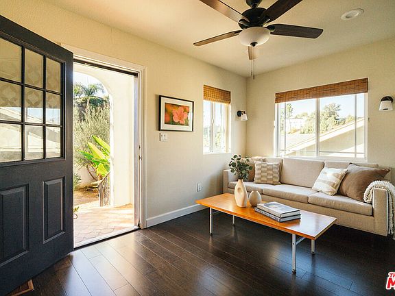 Perched on a quiet hillside street, 3306 Minto Court is a charm-filled Spanish retreat in the heart of El Sereno. From the moment you pass through the walled hacienda-style front garden, find yourself in a light-filled 2 bed/1 bath casita where classic architectural character meets the kind of thoughtful modern upgrades that make life easy. The living room exudes warmth and style: gleaming hardwood floors and wood-paneled walls lead to a built-in dinette area perfect for enjoying meals while gazing at views of the mountains beyond. Enjoy cooking in a fully renovated kitchen with stainless steel appliances, quartz countertops, and plenty of storage. Downstairs, past the dedicated laundry room, find a 132 sqft basement with built-in shelving offering a multitude of possibilities--a wine cellar for your favorite finds, or simply a dream space for organization and storage. Outside, find a fully renovated detached 180 sqft office space accented by elegant tile and French doors that open out onto lush greenery--an inspiring place to work, create, or host guests. The outdoor spaces are where the home truly shine. The current owners have transformed the yard into an entertainer's paradise: two separate fire pit lounges (chic outdoor furniture included!), string lights draping past mature avocado, pomegranate, and orange trees, and lush drought-tolerant plantings evoke resort-style living at its finest. Enjoy dining al fresco with friends and end your evenings curled up on the sofa with a drink and a blanket beside the fire. Practical upgrades make life here as effortless as it is beautiful: the home boasts fully paid-off solar panels that eliminate your electric bill, new roof on main house and office (2024), new electrical panel (2024), central HVAC, EV charging station, whole-house water filtration system, alarm system, double-paned windows updated with new flashing, and more. Located less than a mile from Rose Hill Park and the edge of Debs Park nature reserve, you're also centrally located to DTLA and all the hot shopping and dining in NELA (as well as El Sereno hot spots like Evil Cooks and lil'East Coffee). Don't miss your chance for the best of LA living at an unbelievable price--with its timeless architecture, modern conveniences and breathtaking indoor/outdoor balance, 3306 Minto Court will remind you why you fell in love with California in the first place.