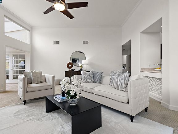 Located in The Heights, one of Rossmoor's most prized neighborhoods, this elegantly updated upper level condo features soaring ceilings, crown molding, a gorgeous eat-in kitchen, smooth ceilings, an enclosed sunroom to expand the main living space, and unobstructed views! Abundant windows, including multiple clerestory windows and skylights, bring the outdoors in and infuse the property with lovely natural light. The comfortable floorplan flows seamlessly from room to room, and the open living room/dining area makes for easy entertaining. Watch the changing cloudscapes throughout the day and savor the expansive views of hillsides and Mt. Diablo beyond. The manor enjoys a tranquil, private courtyard setting just steps from a popular trailhead. To top it all off, the property comes with OWNED SOLAR PANELS and TWO DETACHED GARAGES! Only a handful of Villa Valle models exist in Rossmoor - don't miss this opportunity to own one! Move-in ready and just waiting for you! Welcome home!