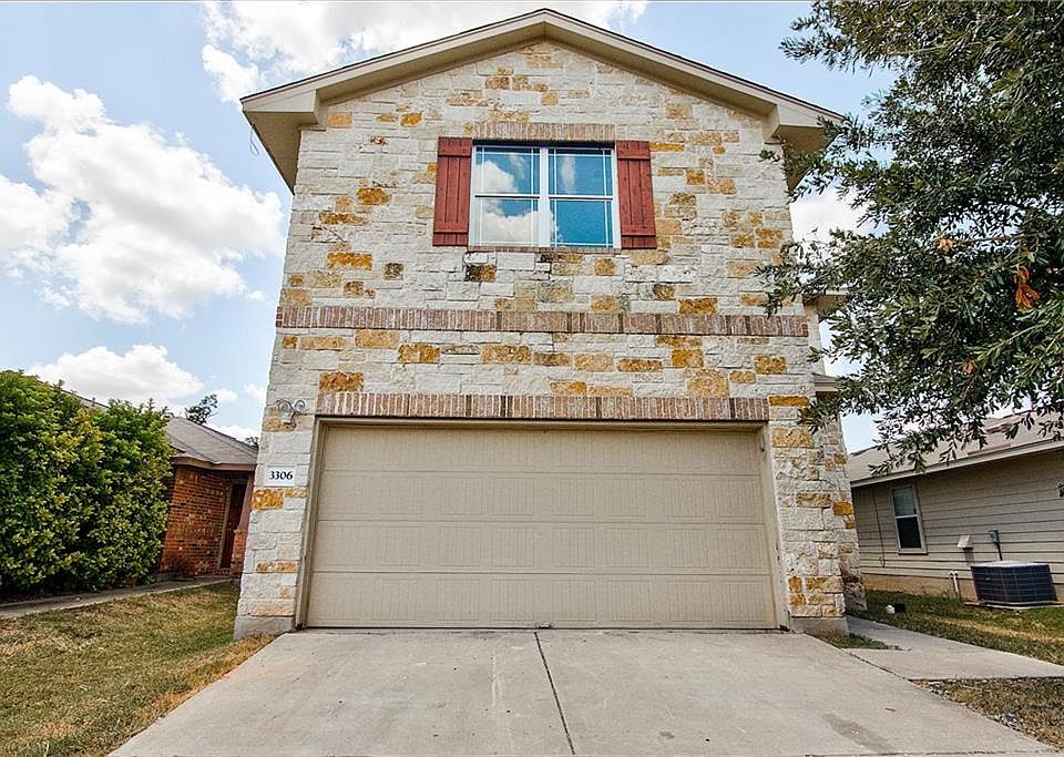 This Austin two-story home offers a two-car garage, a covered back patio, a breakfast bar, quartz kitchen countertops, gas heating, a walk-in master closet and a master bathroom with separated step-in shower and jetted tub.
