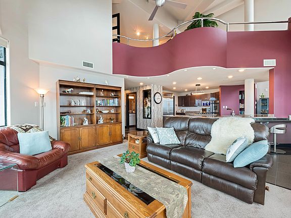 Gorgeous Executive Penthouse. Incredible sweeping views of downtown and endless mountains from this 2 level, 2,957 s/f, 3 bed plus den, 3 full bath. Luxurious high rise suite. Beautiful bright spacious home with impressive 25 ft vaulted ceilings. 4 balconies, 2 gas fireplaces, electric blinds in the livingroom. Spiral staircase. Kitchen is a chef's dream with large center island with gas cooktop. Huge built in fridge, built in double ovens & quartz counter-tops. Highest quality finish thru out. Totally updated. Central a/c. 2 underground side by side parking spaces near elevator lobby. Large private storage room. Resort like amenities. Indoor pool, hot tub, gym, library, games room, workshop and guest suite. Very well maintained complex. Truly impressive. Bring your fussiest buyers.