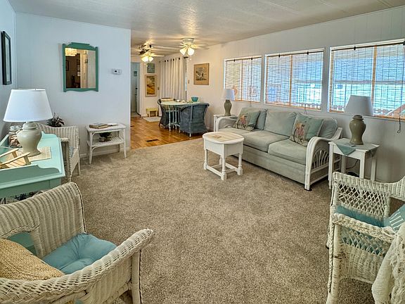 NORTHGATE MOBILE HOME PARK, A 55+ ACTIVE ADULT COMMUNITY. Come view this lovely, COZY AND CLEAN 2 Bedroom 2 FULL bath SPLIT PLAN HOME. It is being sold Turn-key at full list price, to include appliances, furnishings, and home essentials! The home has newer carpeting, a freshly painted interior, bathroom plumbing updates, and it is STYLISHLY furnished front to back! You won't be disappointed! Inviting living room, modern kitchen, spacious master bedroom with en suite bath, and lovely guest room with built-in drawers and counter space! A truly well-appointed oasis! Come and enjoy all that the SPACE COAST has to offer: thrilling rocket launches, Kennedy Space Center, Beaches, and the Indian River nearby. Don't miss your chance to claim this perfect spot where comfort meets adventure! Northgate is a 55+ adult Active Community. All new owners must apply with the office and go through the park's background check, $50 per person. Monthly Income is verified. The land lease monthly is currently $590. This fee includes trash/recycle/yard waste and use of the park's amenities. Water is billed every other month by the park. Northgate has a spacious clubhouse offering Bingo & miscellaneous events during each month, plus a small library, outdoor SWIMMING POOL, and shuffleboard. Northgate also offers a Laundry area, available near the office and mailboxes. Storage for boats and trailers is available. Inquire with park management on availability and pricing. The park does not allow aggressive dog breeds (2 permitted with park approval). NO RENTING permitted. CASH only, plus applicable closing costs. OUT OF TOWN!?!? NO WORRIES, SUNSET CAN DO VIRTUAL SHOWINGS AND WE ARE ABLE TO DO OUR COMPANY'S PAPERWORK REMOTELY. FEEL FREE TO CALL, TEXT, OR EMAIL ME FOR MORE DETAILS. All listing information is deemed reliable but not guaranteed and should be independently verified through personal inspection by appropriate professionals. We do not and cannot guarantee or warrant the accuracy of this information or the condition of this property. Measurements are approximate. The buyer assumes full responsibility for obtaining all current rates of lot rent, fees, and pass-on costs. Additionally, the buyer is responsible for obtaining all rules, regulations, pet policies, etc., associated with the community, park, or home from the community/park manager. We are not responsible for quoting said fees or policies. All new owners must apply with the office and go through the park's background check.
