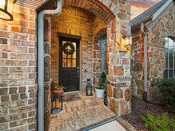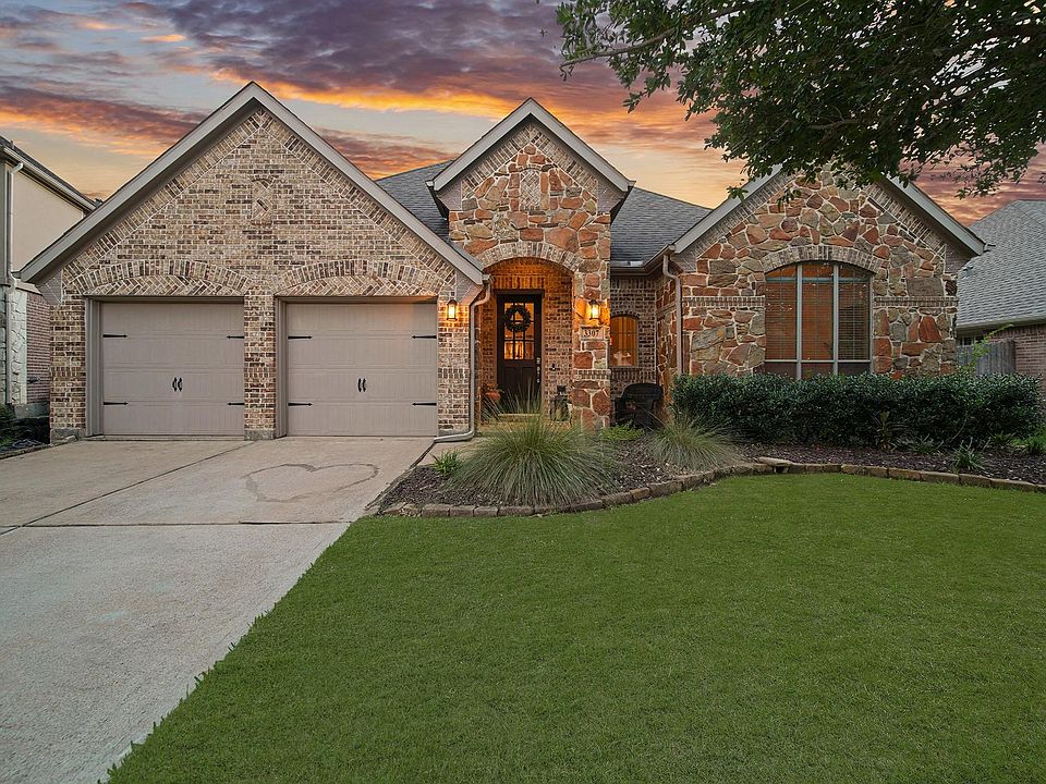 Simply Stunning single-story home located in the desirable Waters Lake of Sienna. Enjoy No back neighbors & a back drop of mature trees. Built by Highland, this home offers exquisite design & striking architectural details throughout. Gorgeous Brick & stone elevation. Study w/ closet & custom doors (optional 5th bed) & elegant dining room flanked by columns. This beautiful layout offers an open concept design w/ custom accents throughout. Gourmet island kitchen w/ built-in SS appliances seamlessly opens to the spacious family room w/ stone fireplace & wood mantle. Picturesque windows frame the space offering lots of natural light. Large Primary suite w/ sitting area, ensuite bath & walk-in closet. Spacious secondary bedrooms + jack & jill bath. Expansive covered patio w/ flagstone overlooks the fabulous backyard w/ views of the wooded nature area just behind the home. Steps away from Camp Sienna & Walking distance to Scanlan Oaks Elementary. Zoned to Ridgepoint. Low tax rate!
